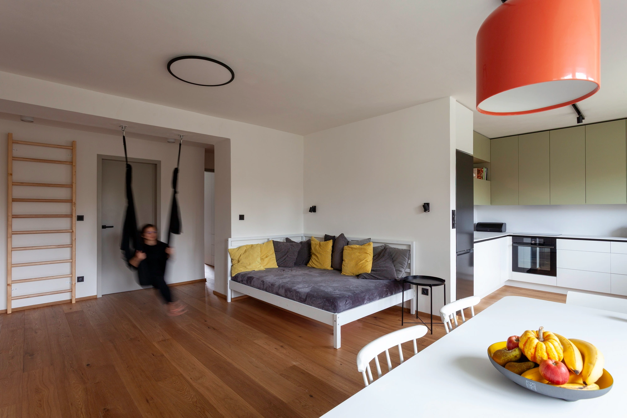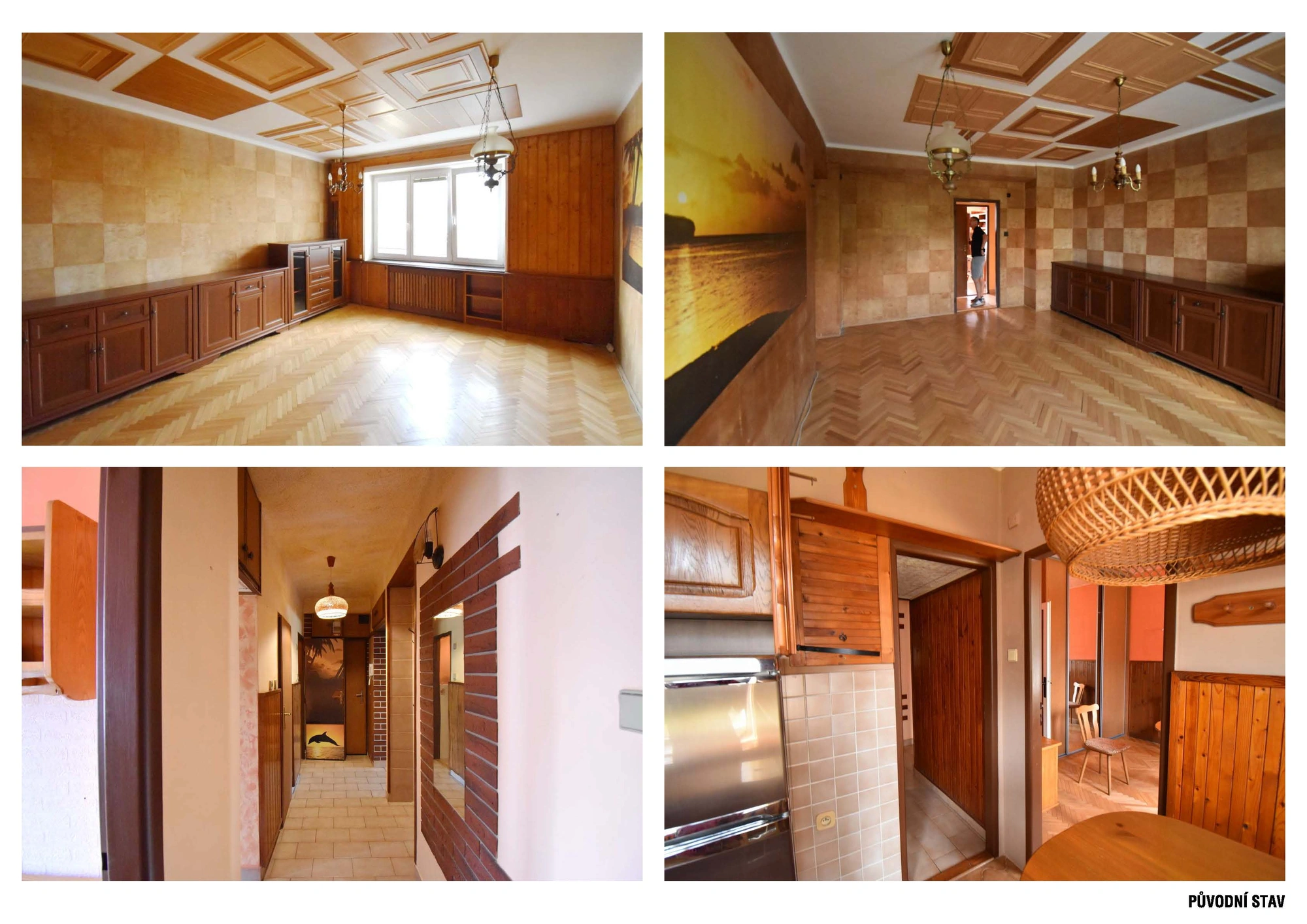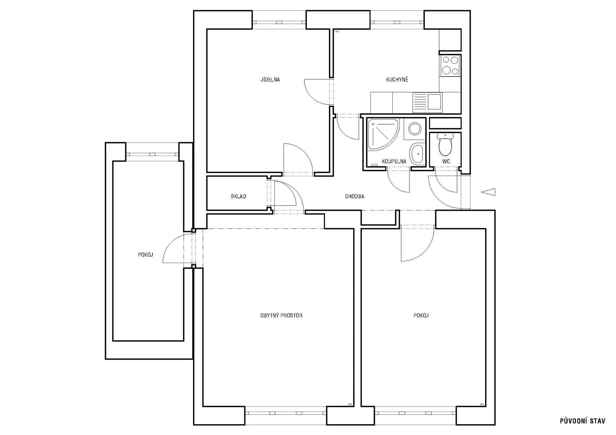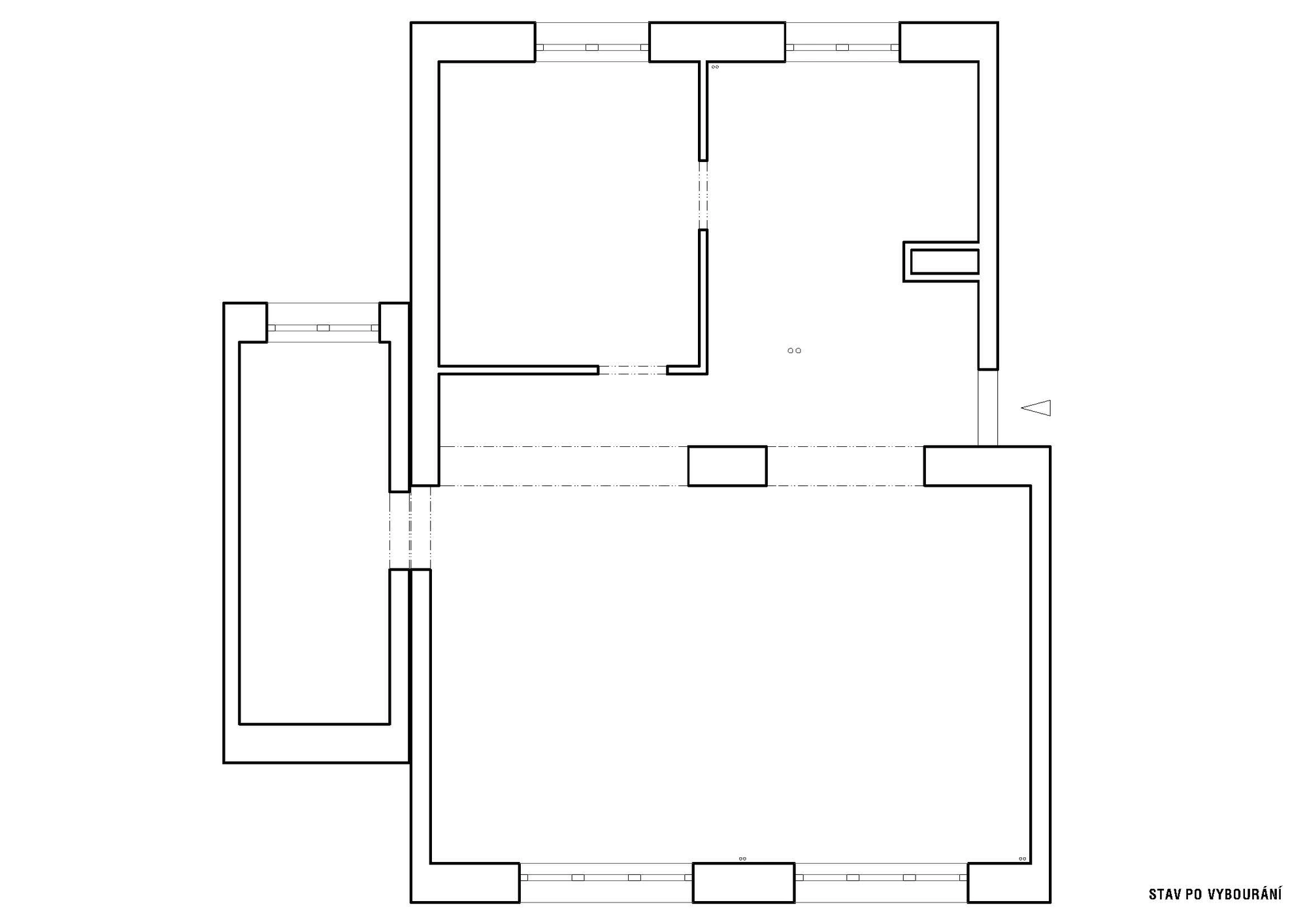 Byt až po strop zanesený nápady z 80.a 90.let. S malými pokoji a neústojným sociálním zázemím. Orientace k rušné komunikaci ale i do společné klidné zahrady starého Braníka. Nosný systém zděného bytového domu, co nabízí velkou svobodu. Měníme zcela dispozici a hodně bouráme.