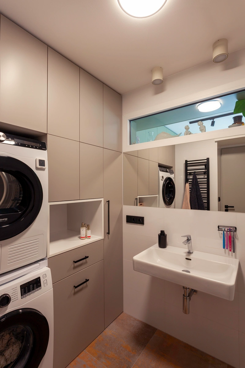 Přes důsledné hlídání rozpočtu je docíleno velkorysého obytného prostoru orientovaného ke komunikaci a klidných pokojů směrem do zahrady. Nová pozice koupelny prosvětlené oknem z kuchyně, společenská lavice, jednoduché kompozice, jemná práce s barvami a světlem. Nový domov pro pětičelnnou rodinu mých přátel.